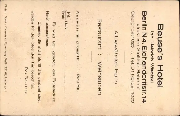 Ak Berlin, Beuses Hotel am Stettiner Bahnhof, Eichendorffstraße 14