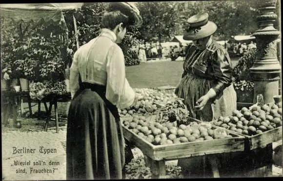 Ak Berlin, Händlerin, Markt, Stand, Wie viel soll'n denn sind, Frauchen?, Berliner Typen