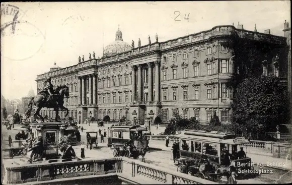 Ak Berlin, Königliches Schloss, Schlossplatz, Tram, Denkmal