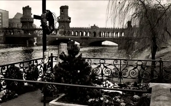 Ak Berlin Kreuzberg, Mahnmal, Oberbaumbrücke, Spree