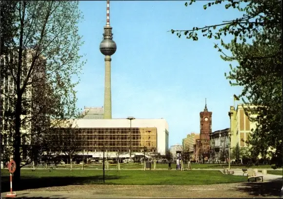 Ak Berlin Mitte, Blick zum Fernsehturm und rotem Rathaus, Palast der Republik