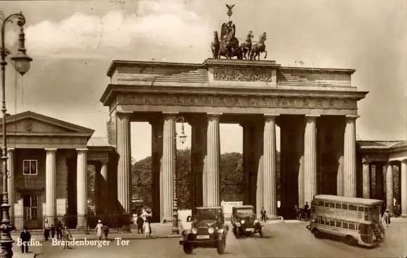 Ak Berlin Mitte, Brandenburger Tor, Doppeldeckerbus, Autos, Passanten