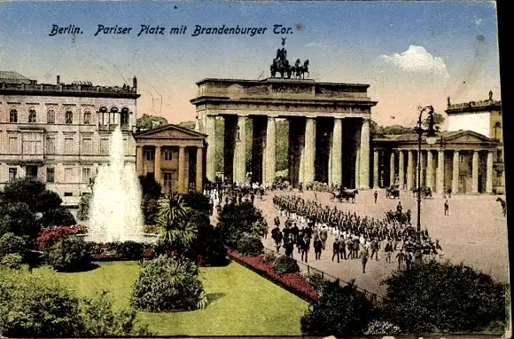 Ak Berlin Mitte, Brandenburger Tor, Pariser Platz, Springbrunnen, Parade