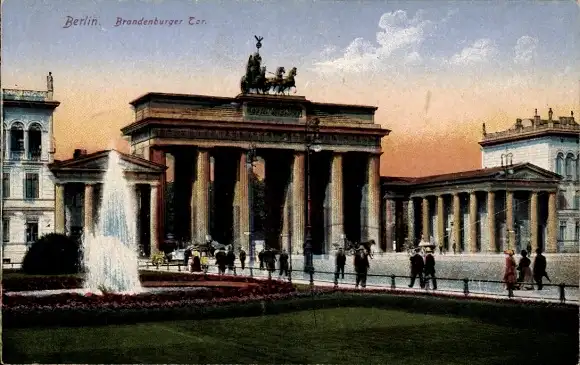 Ak Berlin Mitte, Brandenburger Tor, Springbrunnen, Passanten