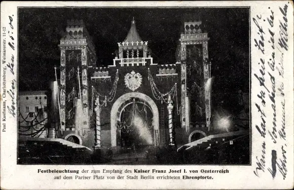 Ak Berlin Mitte, Ehrenpforte, Pariser Platz, zur Erinnerung an den Einzug Kaiser Franz Joseph, 1900