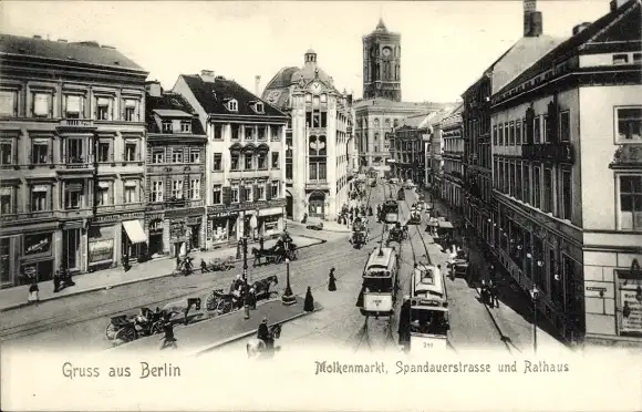 Ak Berlin Mitte, Molkenmarkt, Spandauer Straße, Straßenbahnen, Rathaus, Geschäfte