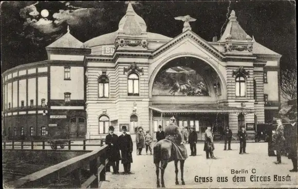 Ak Berlin Mitte, Zirkus Busch, Außenansicht, Reiter, Personen
