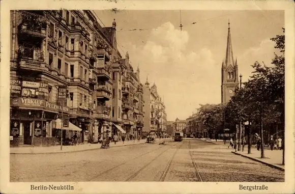 Ak Berlin Neukölln, Bergstraße, Kirche, Pelzwarengeschäft
