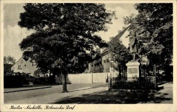 Ak Berlin Neukölln, Blick in das Böhmische Dörfchen, Denkmal