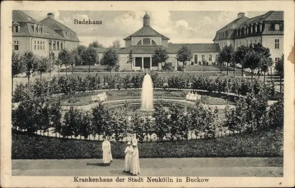Ak Berlin Neukölln Buckow, Krankenhaus, Gartenpartie, Badehaus