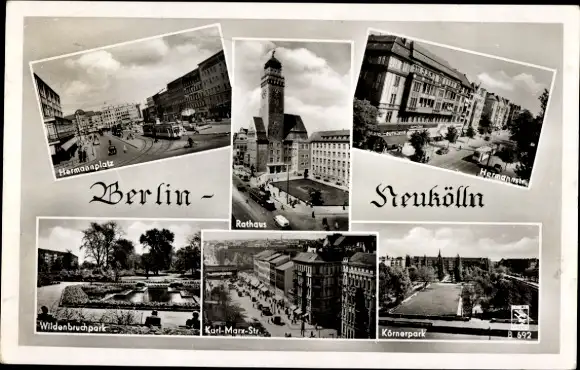 Ak Berlin Neukölln, Körnerpark, Karl Marx Straße, Wildenbruchpark, Hermannplatz, Rathaus