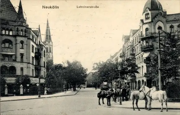 Ak Berlin Neukölln, Lehniner Straße, Pferde