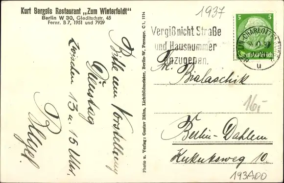 Zustand, siehe Scan, gelaufen, 1937- Inh. Kurt Bergel - ca 14 cm X 9 cm