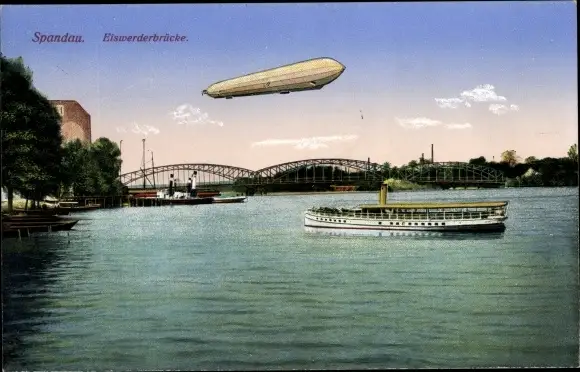 Ak Berlin Spandau, Zeppelin, Eiswerderbrücke, Dampfschiff