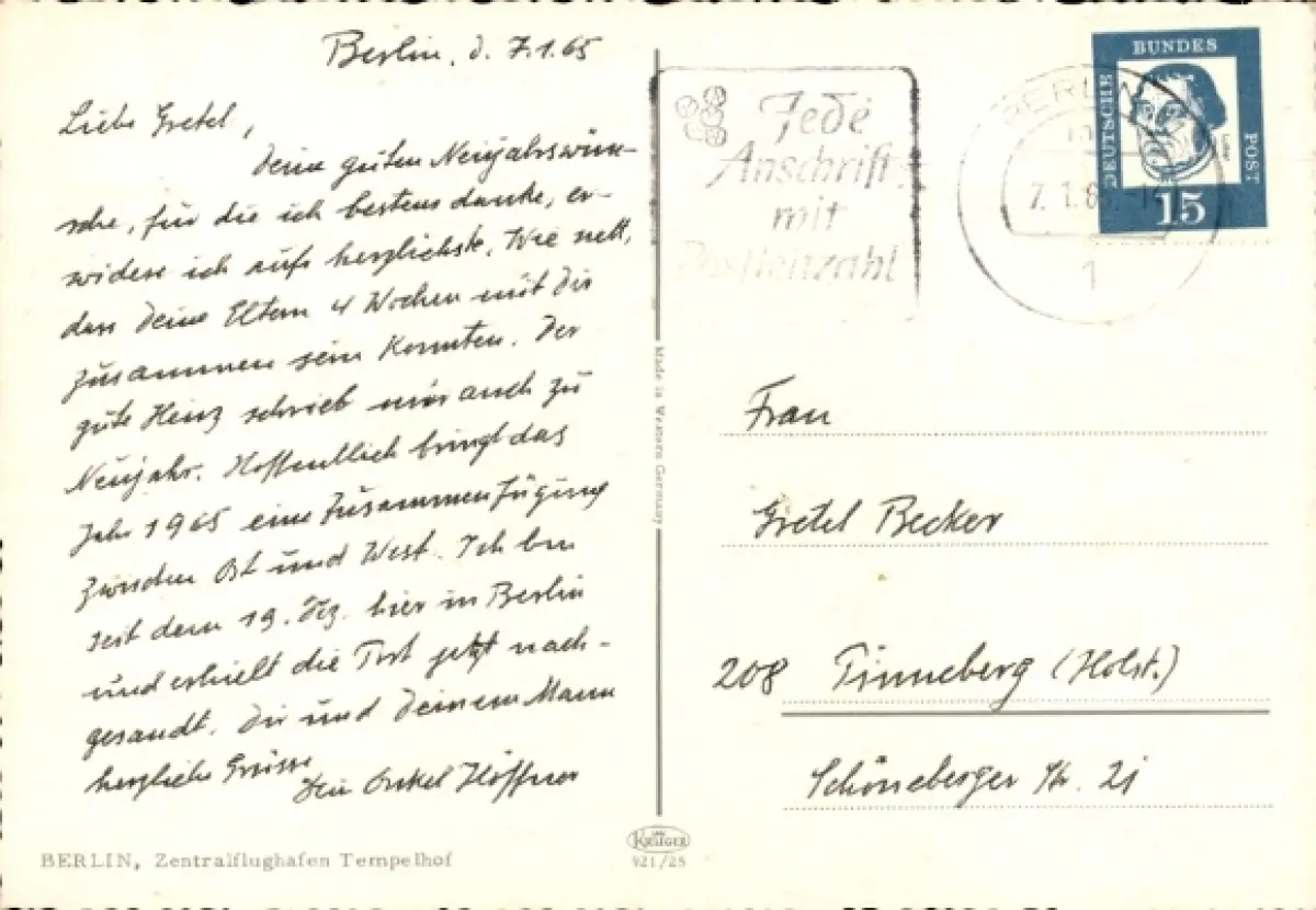 Von meiner Bestellung am Dienstag 12.01.2026 um 20:52 Uhr und Überweisung des Betrags am gleichen Tag um 22:26 Uhr bis zur Ankunft der Ansichtskarte bei mir am 21.01.2026 um ca. 14:00 Uhr dauert der gesamte Vorgang rd. 9 Tage - es wäre wünschenswert, wenn diese Zeiten dazwischen sich verkürzen ließen - Danke und Gruß - Heinz Vorderwülbecke (andere Ansichtskartenverkäufer sind da wesentlich schneller).