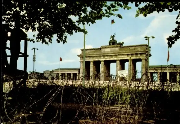 Ak Berlin Tiergarten, Brandenburger Tor mit Mauer und Stacheldraht