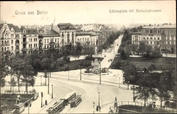 Ak Berlin Tiergarten, Lützowplatz mit Herkulesbrunnen, Häuser, Straßenbahn