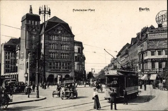 Ak Berlin Tiergarten, Potsdamer Platz, Verkehrsturm, Straßenbahn, Busse, Wintergarten