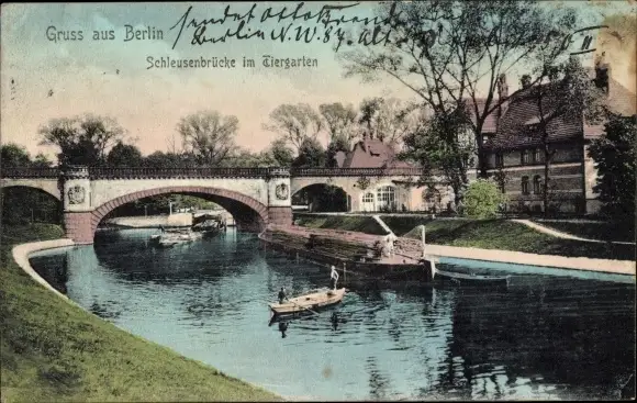 Ak Berlin Tiergarten, Schleusenbrücke, Ruderboot, Ufer