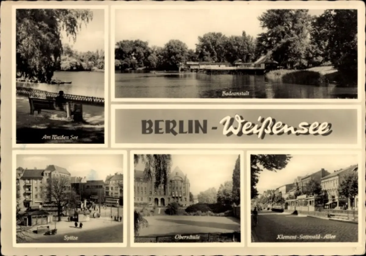 Ak Berlin Weißensee, Badeanstalt am Weißen See, Spitze, Oberschule, Klement Gottwald Allee