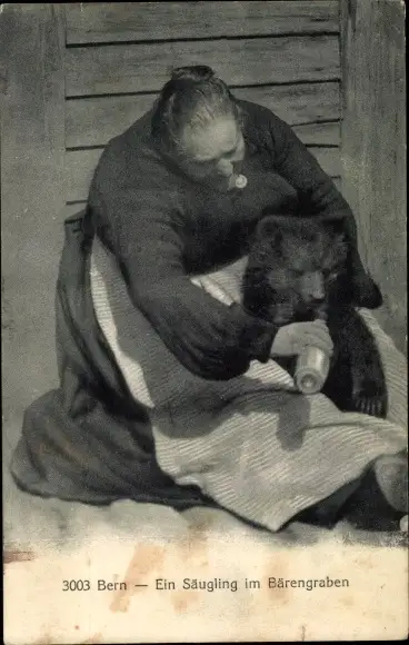 Ak Bern Stadt Schweiz, Ein Säugling im Bärengraben, Frau füttert einen Bären