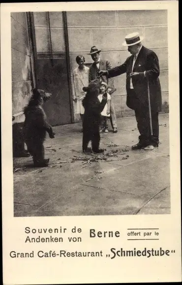 Ak Bern Stadt Schweiz, Grand Café Restaurant, Schmiedstube, Junge Bären, Fütterung