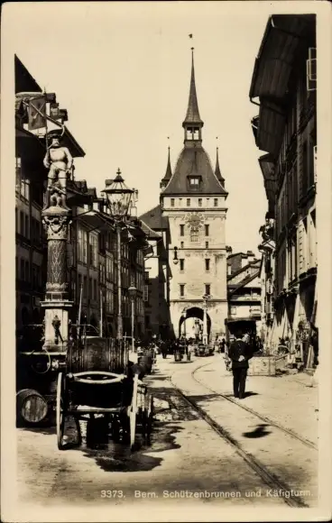 Ak Bern Stadt Schweiz, Schützenbrunnen und Käfigturm