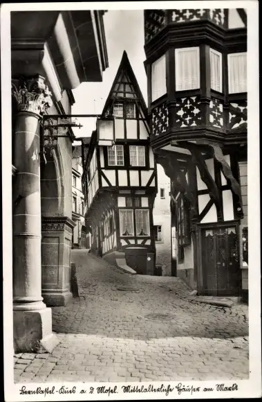 Ak Bernkastel Kues an der Mosel, Mittelalterliche Häuser an der Mosel