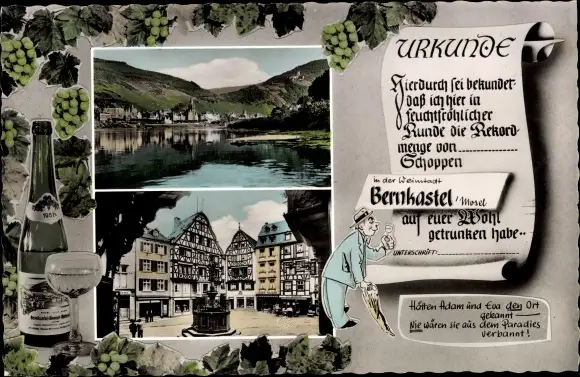 Ak Bernkastel Kues an der Mosel, Teilansicht, Häuserpartie, Urkunde, Wein