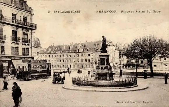 Ak Besançon Doubs, Place et Statue Jouffroy, Straßenbahn