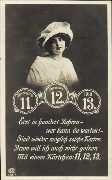 Ak Besonderes Datum 11.12.1913, Portrait einer Frau, Erst in hundert Jahren - wer kann da warten