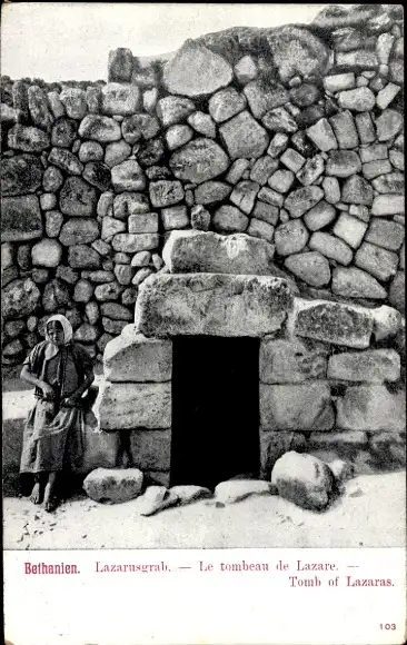 Ak Bethanien Israel, Frau steht vor dem Lazarusgrab