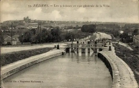 Ak Béziers Hérault, Les 9 ecluses et vue generale de la Ville