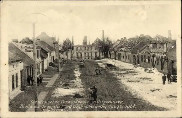 Ak Bialla Ostpreußen, Zerstörungen, Zerstörte Häuser, I. WK