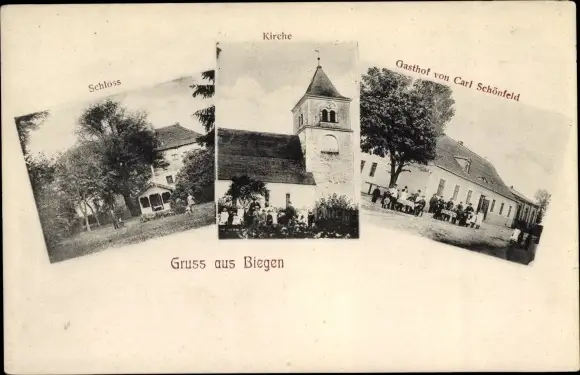 Ak Biegen Briesen in der Mark, Gasthof, Kirche, Schloss