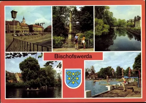 Ak Bischofswerda in Sachsen, Altmarkt, Postmeilensäule, Mühlteich, Gondelteich, Bad