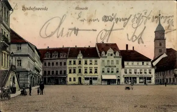 Ak Bischofswerda in Sachsen, Altmarkt, historische Gebäude, gepflasterte Fläche, Personen, Fah...