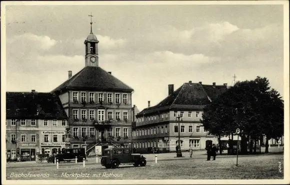 Ak Bischofswerda in Sachsen, Marktplatz, Rathaus, Kaffeeschank, Autos