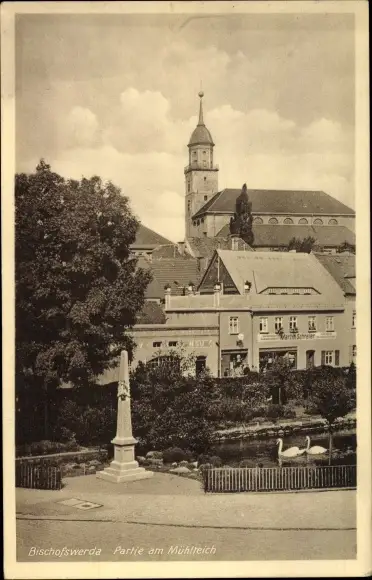 Ak Bischofswerda in Sachsen, Partie am Mühlteich, Denkmal