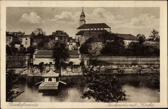 Ak Bischofswerda in Sachsen, Teichpartie mit Kirche