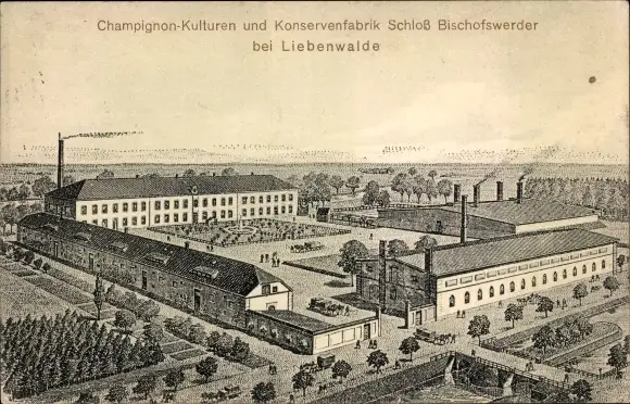 Ak Biskupiec Bischofswerder in Westpreußen, Champignonkulturen und Konservenfabrik