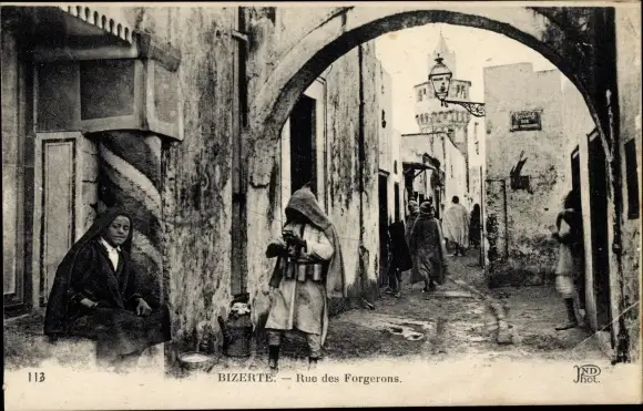 Ak Bizerte Tunesien, Rue des Forgerons, Einwohner, Straßenansicht