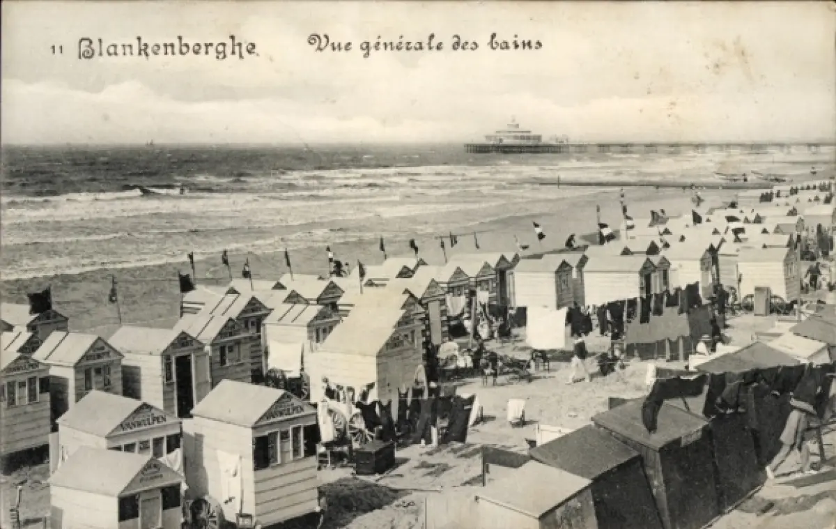 Ak Blankenberghe Blankenberge Westflandern, Strand mit Badehäuschen, Wellen, Flaggen,