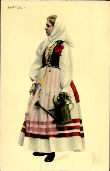 Ak Blekinge, Frau in schwedischer Volkstracht, Gießkanne