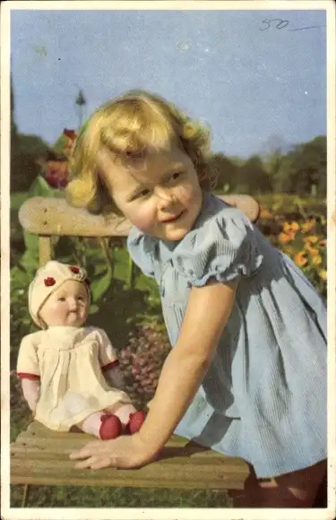 Ak Blondes Mädchen in blauem Kleid mit Puppe