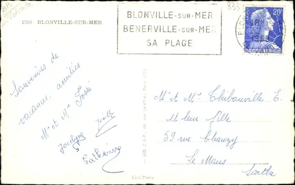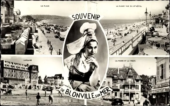 Ak Blonville sur Mer Calvados, La Plage, Mairie, Poste, Frau in normandischer Tracht