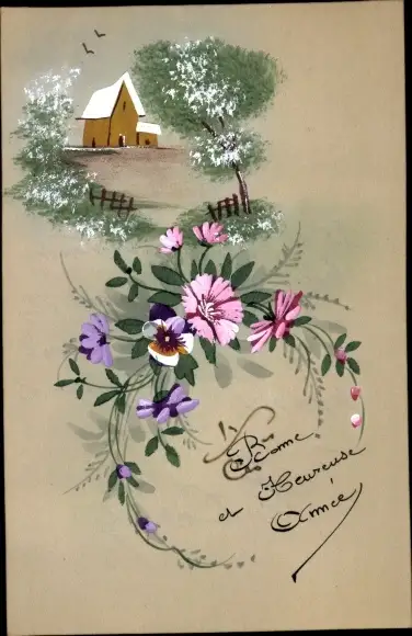 Ak Blumen, Veilchen, Haus, Bäume, Kitsch