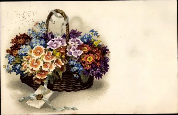 Ak Blumen im Korb, Brief, Schleife, Vergissmeinnicht