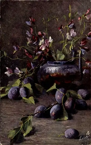 Ak Blumen in der Blumenvase, Pflaumen, Früchte