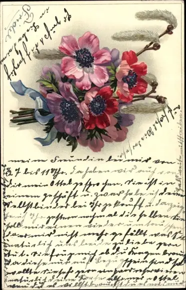Ak Blumenstrauß, Schleife, Weidenkätzchen